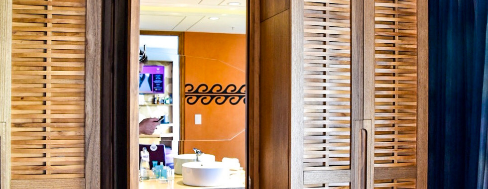 Our spacious room had a large King bed, lounge area, giant bathroom, mini bar and balcony. The large bed, with white linens and colorful accent pillows, was flanked by two side tables, each with touch lamps and dual power outlets that each have two USB ports. A mini bar and coffee maker has a menu that reads “Every Thing You Want to Eat & Drink”, promoting their “Anything, Anywhere” motto where you can order just about anything you want, at whatever time of day or night you want it.