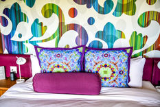 The guest rooms are visually appealing, fun and insanely well-appointed. Rich wooden accents, coupled with bright pops of color on an elaborate accent wall combine with modern, simple lines to create a surprisingly tasteful, exciting decor.